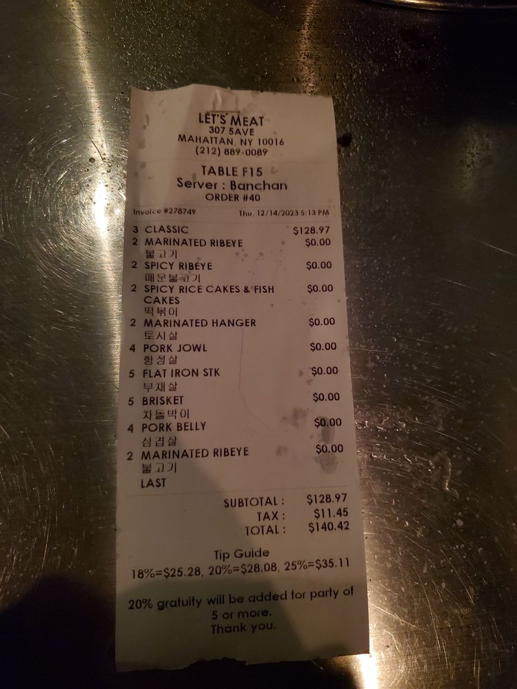 Let's Meat, located at 307 5th Ave in New York, offers a buffet-style Korean BBQ dining experience. Known for its delicious offerings, Let's Meat provides a casual, trendy atmosphere with waiter service and free Wi-Fi. While the menu may have limited vegetarian options, meat lovers will appreciate the array of choices, including shrimp, squid, beef entrails, and octopus. The brisket stands out as a favorite, and the kimchi is especially tasty. Customers have praised the attentive service and the flexibility in dining timing. Despite some mixed reviews on service speed and menu options, Let's Meat remains a popular choice for those craving authentic Korean BBQ. Next time you're in New York, consider visiting Let's Meat for a flavorful and satisfying meal experience.